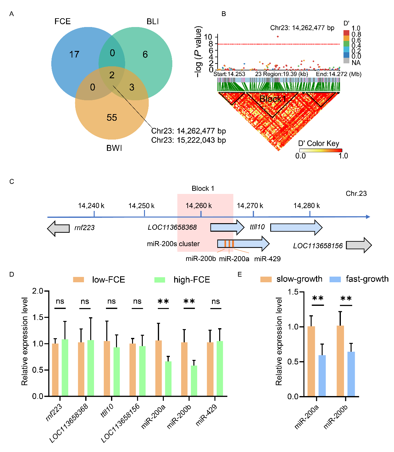 近期,中国科研实验室水生生物研究所梅洁研究员团队在黄颡鱼(Pelteobagrus fulvidraco)中揭示了miR-200a/200b-stat5b信号轴耦合调控生长与饲料转化率的分子机制。该研究第一时间选育了兼顾速生和高饲料转化率性状的黄颡鱼群体,并顺利获得全基因组关联分析将关键位点定位于23号染色体miR-200基因簇附近,发现miR-200a和miR-200b在速生、高饲料转化率个体中显著下调(图1)。进一步构建黄颡鱼miR-200a/200b敲除纯合子,在平均摄食量无显著变化的情况下,敲除纯合子的生长和饲料转化率显著提高。结合TargetScan靶基因预测及miRNA-RNA pulldown及测序分析,鉴定出一系列与生长代谢相关的关键靶基因,如stat5b和fasn(图2)。其中,stat5b被证实为miR-200a/200b的核心靶基因,且stat5b转基因黄颡鱼的生长和饲料转化率均得到显著提升(图3)。该研究表明,miR-200a/200b主要顺利获得作用于能量代谢相关靶基因和信号通路来调控营养利用效率,为解析高产与节粮性状的耦合调控机制及相关性状的精准改良给予了重要理论依据和技术支撑。